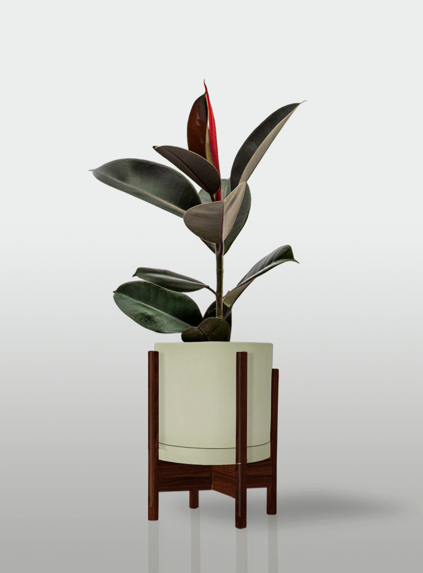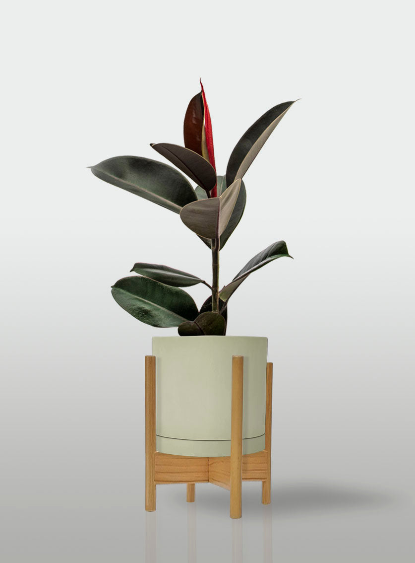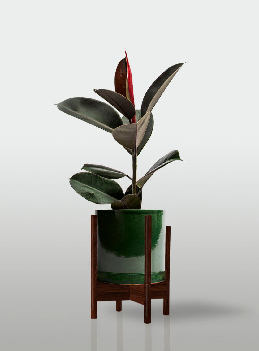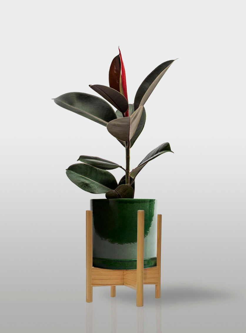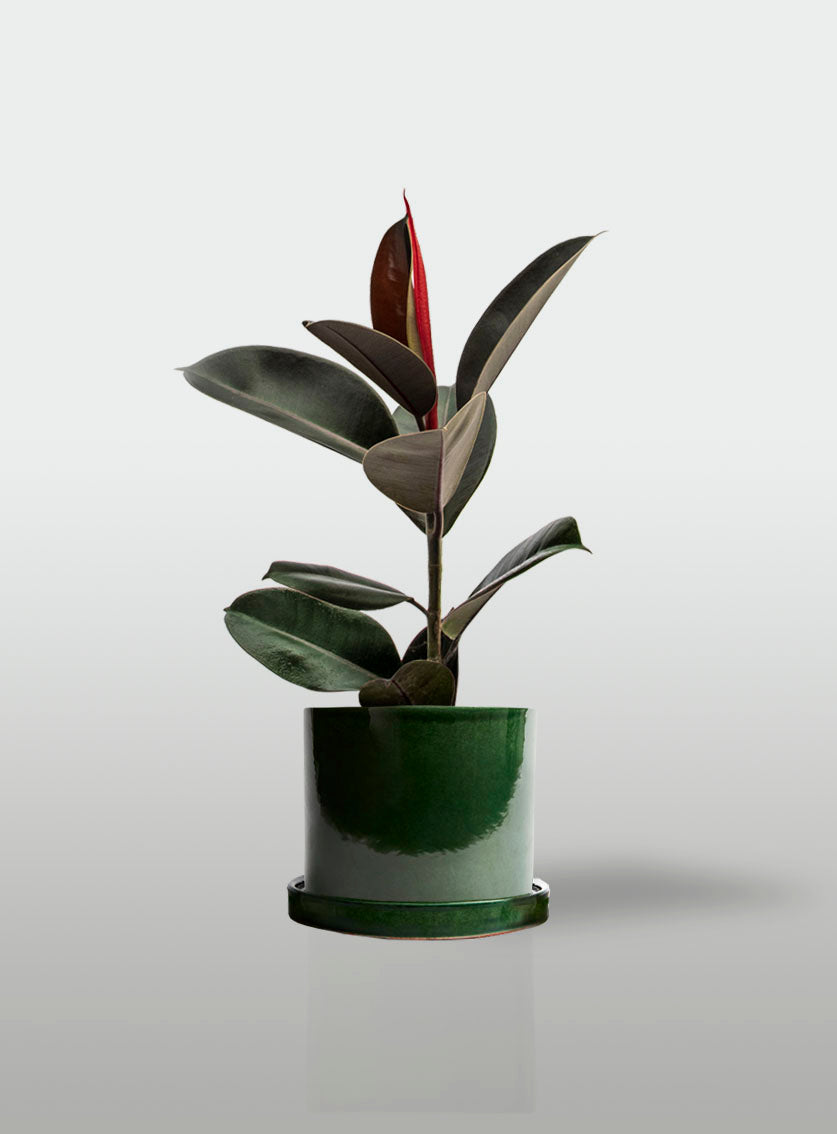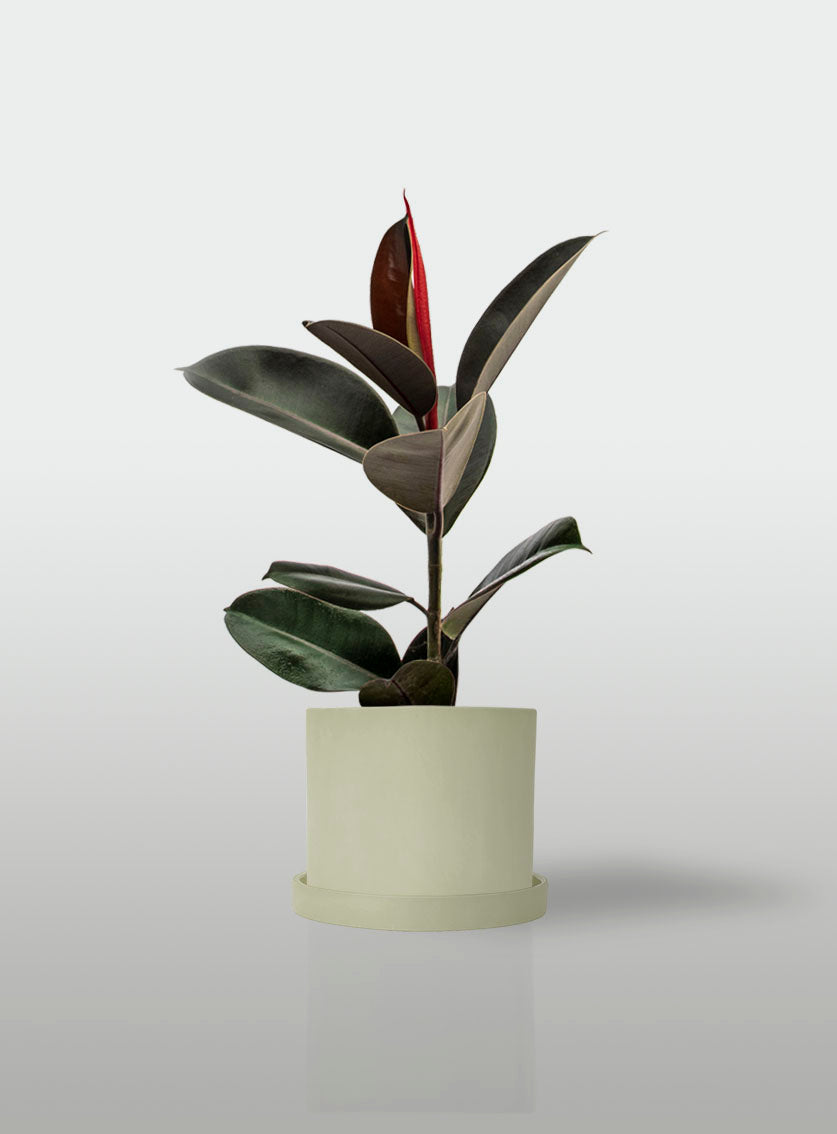 El Hule Cabernet es una planta de apariencia elegante gracias a sus hojas brillantes de color verde oscuro y sus toques de color vino. Si quieres darle a tu casa un toque sofisticado el Hule Cabernet es la planta para ti, además no requiere de cuidados excesivos.