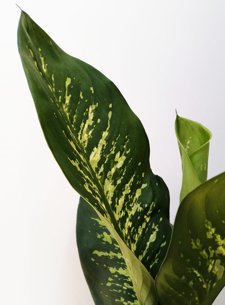 Sus hojas son muy grandes y variegadas, es una planta muy resistente y frondosa, perfecta para interiores con luz media o brillante indirecta.