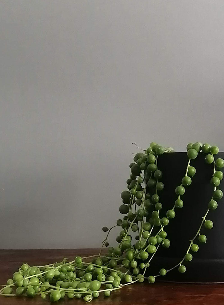 La planta Rosario o String of Pearls es una planta suculenta original y fácil de cuidar. Sus hojas redondas y carnosas almacenan agua por lo que es una planta que no requiere mucho riego. Colócala en un lugar muy luminoso, de preferencia en el borde de una mesa o ventana para que sus perlas puedan caer libremente.